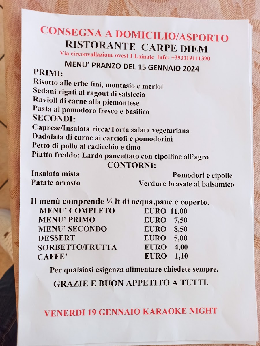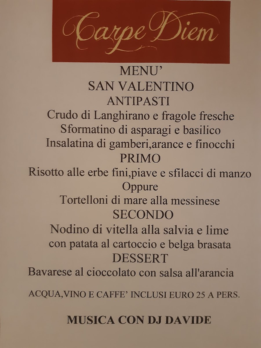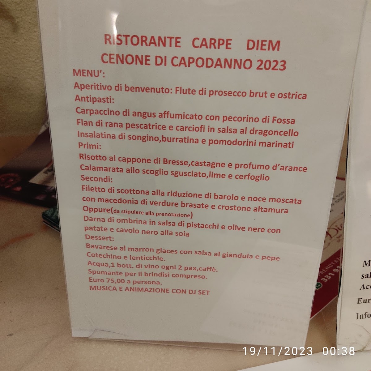 Ristorante Carpe Diem offers a delightful selection of Italian dishes, blending tradition with creativity. The menu features a variety of exquisite options that will satisfy any palate. Standout dishes include the rich and creamy Risotto Alle Castagne Mantecato Con Montasio, which combines chestnuts and Montasio cheese for a comforting experience. For meat lovers, the Costine Di Agnello (lamb ribs) and Costato Di Vitello Alla Griglia (grilled veal chop) are particularly memorable, offering tender and flavorful cuts. Vegetarians will appreciate the earthy tones in the Risotto Salsiccia Merlot E Asiago, where the sausage and wine create a beautiful balance. Another crowd-pleaser is the Risotto Da Sogno, a dreamy risotto that is packed with flavor and elegance. Pasta enthusiasts will be drawn to the Pipe Al Ragù Di Coniglio, a savory rabbit ragù served with perfectly cooked pasta. For dessert, don’t miss the Dessert Carpe Diem, a sweet finale that is as impressive as the main courses. The Mousse Di Fragole offers a light, refreshing end to the meal, while the Agmello Bruciato Con Verdure Scotte stands out with its charred lamb paired with roasted vegetables. Each dish showcases fresh ingredients and expert craftsmanship, making for a memorable dining experience.