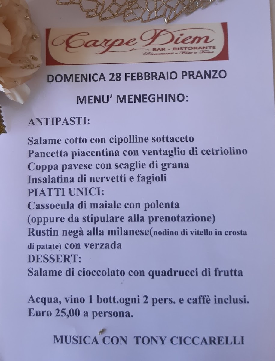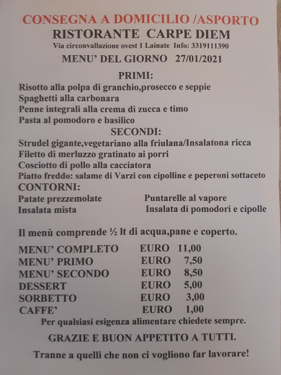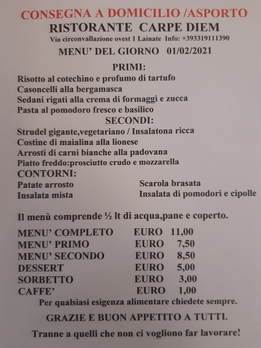 Ristorante Carpe Diem offers a delightful selection of Italian dishes, blending tradition with creativity. The menu features a variety of exquisite options that will satisfy any palate. Standout dishes include the rich and creamy Risotto Alle Castagne Mantecato Con Montasio, which combines chestnuts and Montasio cheese for a comforting experience. For meat lovers, the Costine Di Agnello (lamb ribs) and Costato Di Vitello Alla Griglia (grilled veal chop) are particularly memorable, offering tender and flavorful cuts. Vegetarians will appreciate the earthy tones in the Risotto Salsiccia Merlot E Asiago, where the sausage and wine create a beautiful balance. Another crowd-pleaser is the Risotto Da Sogno, a dreamy risotto that is packed with flavor and elegance. Pasta enthusiasts will be drawn to the Pipe Al Ragù Di Coniglio, a savory rabbit ragù served with perfectly cooked pasta. For dessert, don’t miss the Dessert Carpe Diem, a sweet finale that is as impressive as the main courses. The Mousse Di Fragole offers a light, refreshing end to the meal, while the Agmello Bruciato Con Verdure Scotte stands out with its charred lamb paired with roasted vegetables. Each dish showcases fresh ingredients and expert craftsmanship, making for a memorable dining experience.
